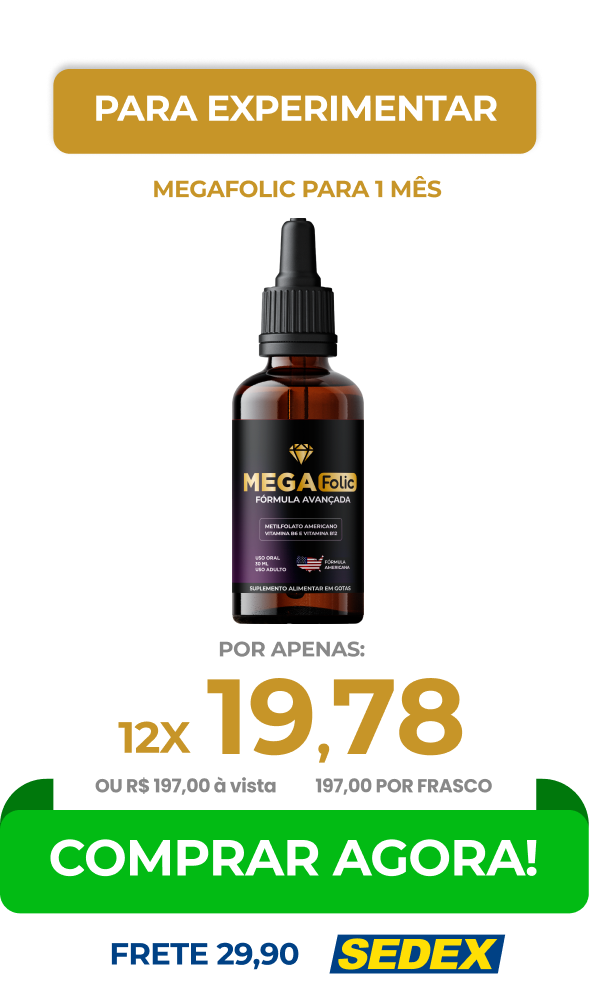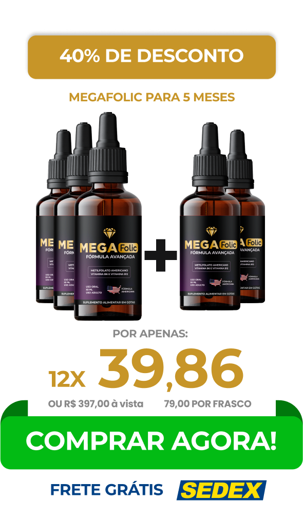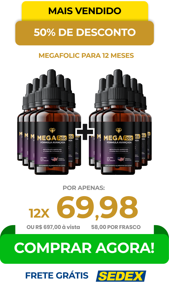 O Mega Folic tem como principal composto o Metilfolato (B9 - Ácido Fólico) ele é o ÚNICO composto da família de vitaminas b9 que não altera no organismo quando tomado com outras medicação (hipertensão, diabete, tireoide, controlados). Atua no escurecimento do cabelo e juntamente com a vitamina B6 e vitamina b12.